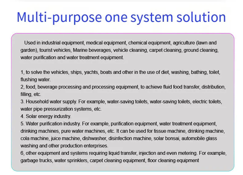 8.Pressure Switch Type Features: When the water turned off, it will automatically cut off power,the motor is stopped. After the water turned on, will automatically power on, motor running.