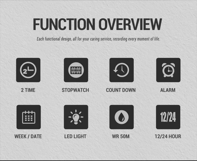 8.Function:2time, Chrono, Alarm,Date, Week, LED Light, Count down,12/24 hour clocko